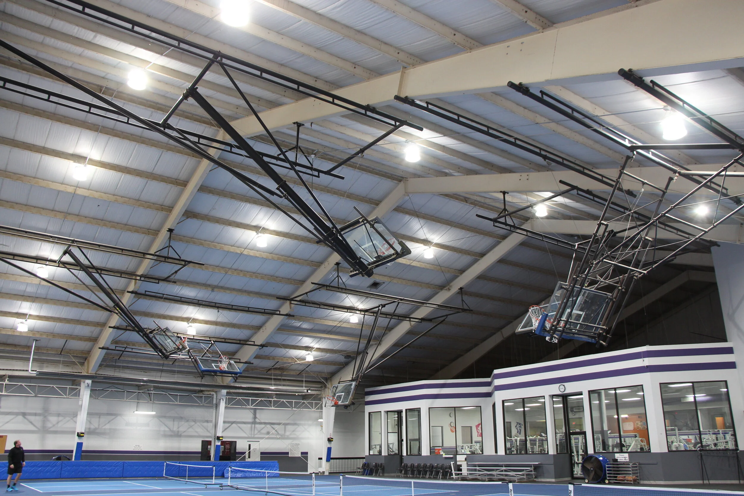 The project included removal of the existing lighting system and unistrut that the fixtures were mounted on. Ownership decided to keep the basketball hoops mounted above the court area which meant that a reflective ceiling liner could not be installed around the hoops. This meant a direct lighting application had to be used in order to deliver enough light to the pickleball playing area. The LED System was installed in a manner to ensure consistent light levels and that there wouldn’t be any dark spots on the courts.